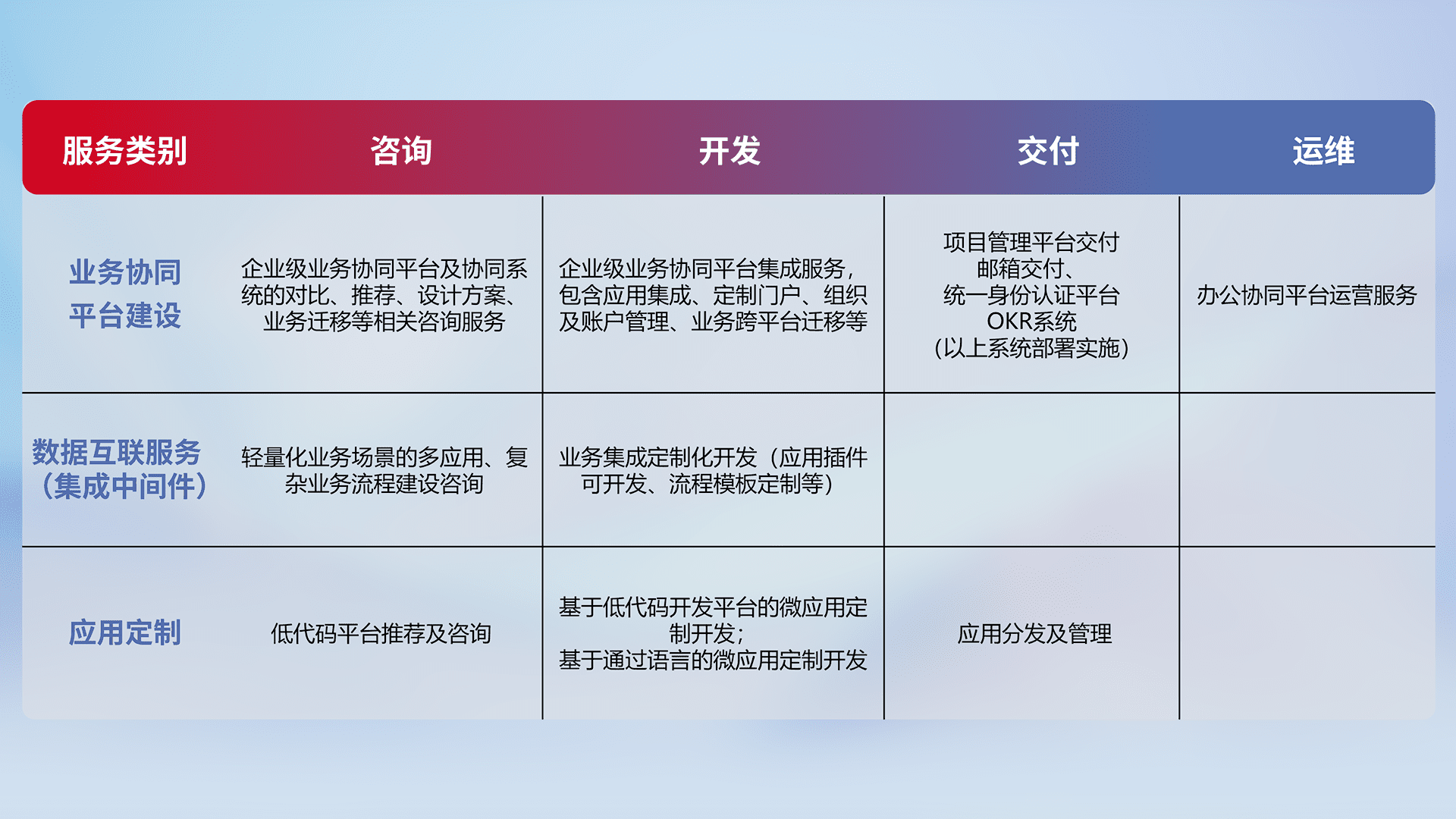 针对钉钉、、、企微、、、IDaas等平台级产品提供产品的规划、、、、方案、、交付、、、定制化开发等服务,,实现如统一协同办公、、智能客户服务、、、、混合会议管理、、、智能数据查询、、、等业务场景,,,实现数字化转型。。。
